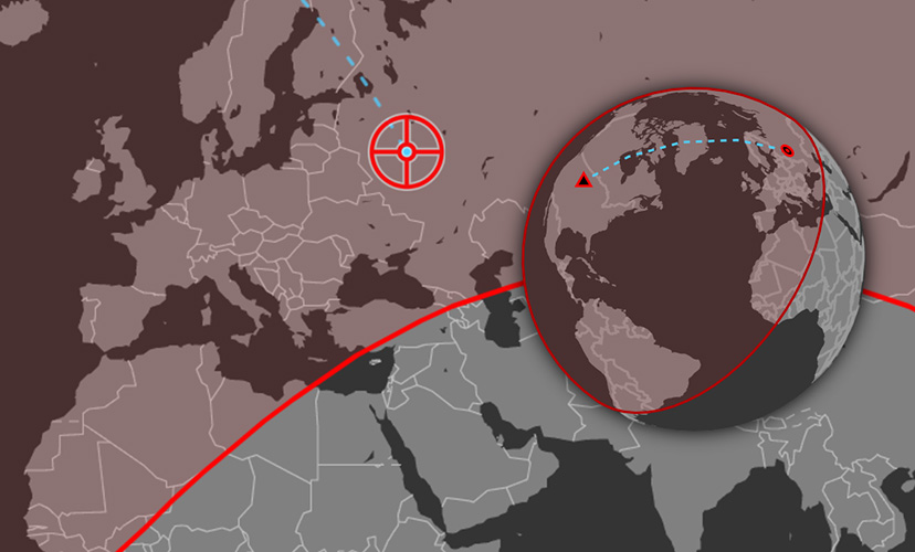 It is worth noting that the standard "Web Mercator" map projection can produce considerable distortion, making weapon ranges (and missile paths) look very “curved” out of alignment. They are, in fact, perfect circles or great circle paths, as indicated by the globe display in the top right corner of the screen. The globe display will move so that the center of the display corresponds with the center of the map display, and similarly the globe can itself be dragged to change the map view.